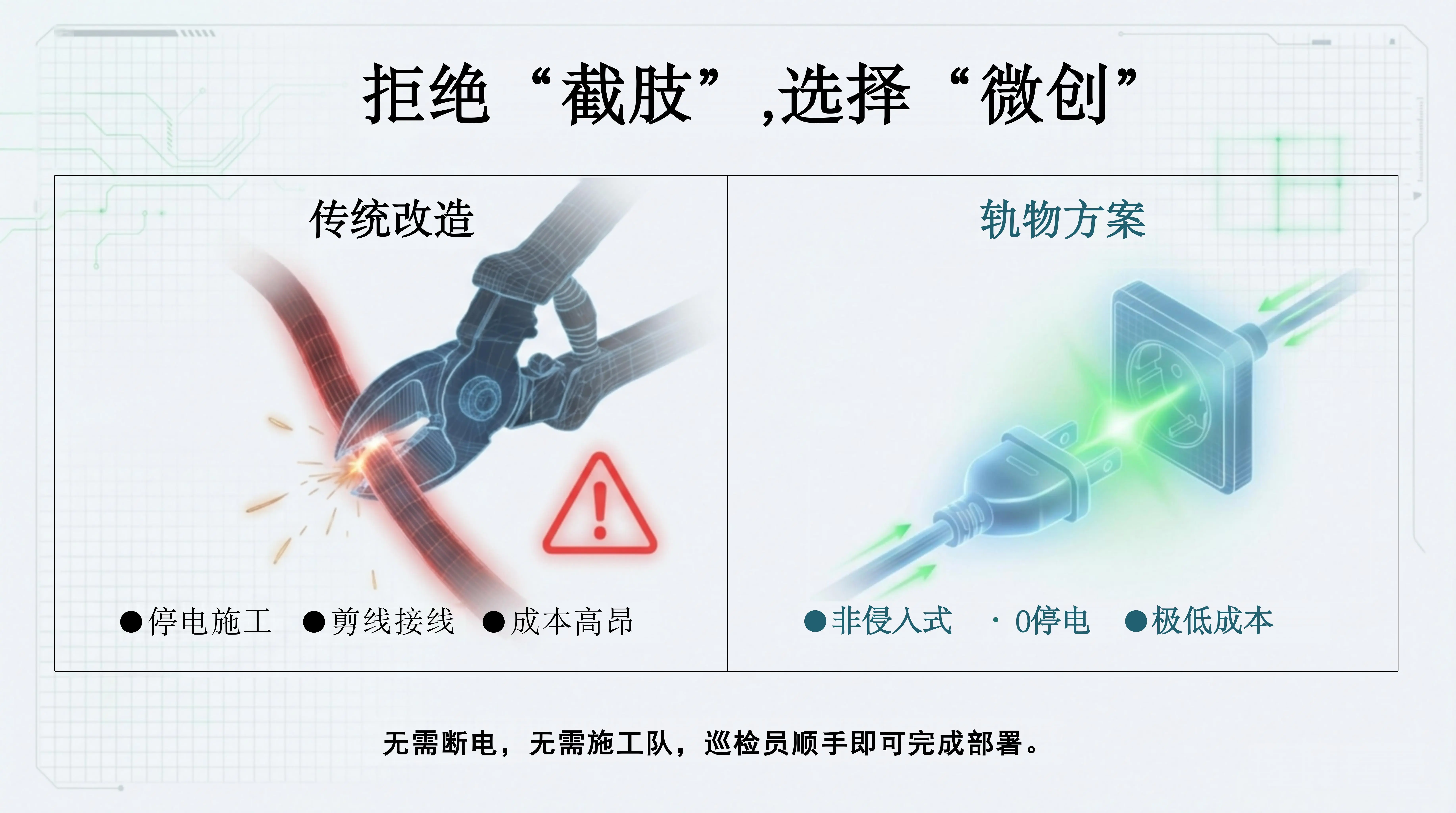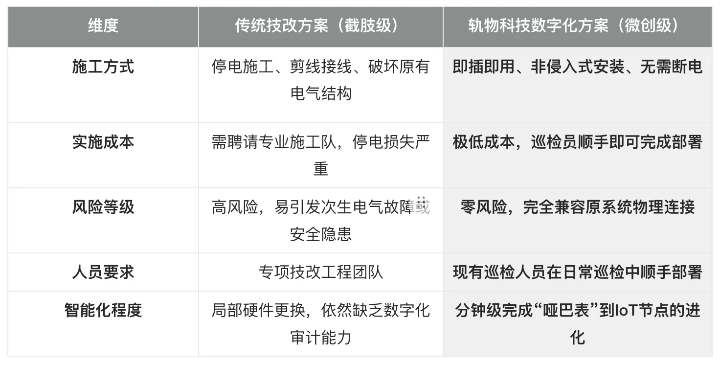 相对于传统技改如同“截肢”般的停电、剪线、高成本改造,轨物科技倡导“微创手术”级的数字化升级。
