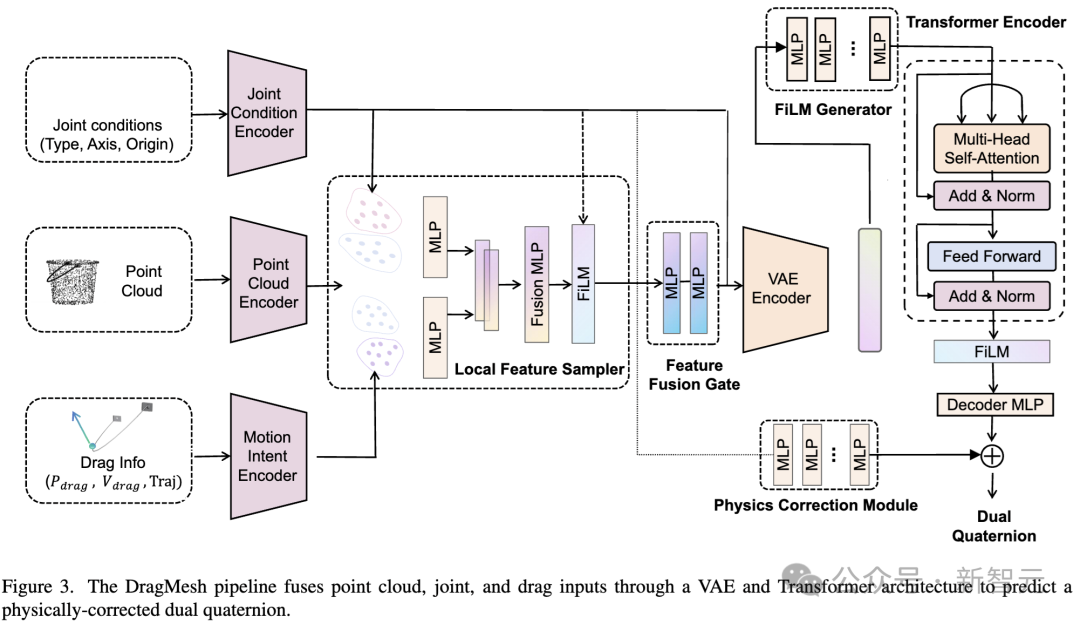 几何回归:团队设计了专用的 KPP-Net (Kinematics Prediction Network) 。不同于通用的点云编码器,KPP-Net采用了双流注意力机制,专门用于从 Mesh 和拖拽信号中回归精准的关节轴和原点。