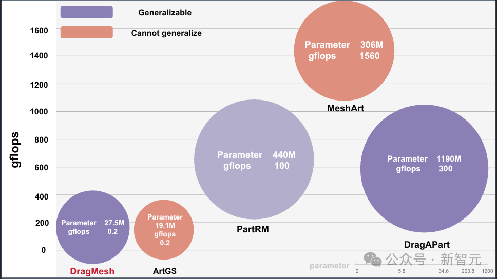 性能对比,横轴为计算量 (GFLOPs),气泡大小代表参数量。紫色气泡代表现有的通用模型(如DragAPart, PartRM),它们往往参数量巨大且计算昂贵 。DragMesh(左下角)的核心生成模块参数量仅为27.5M,GFLOPs 仅为5.2 。