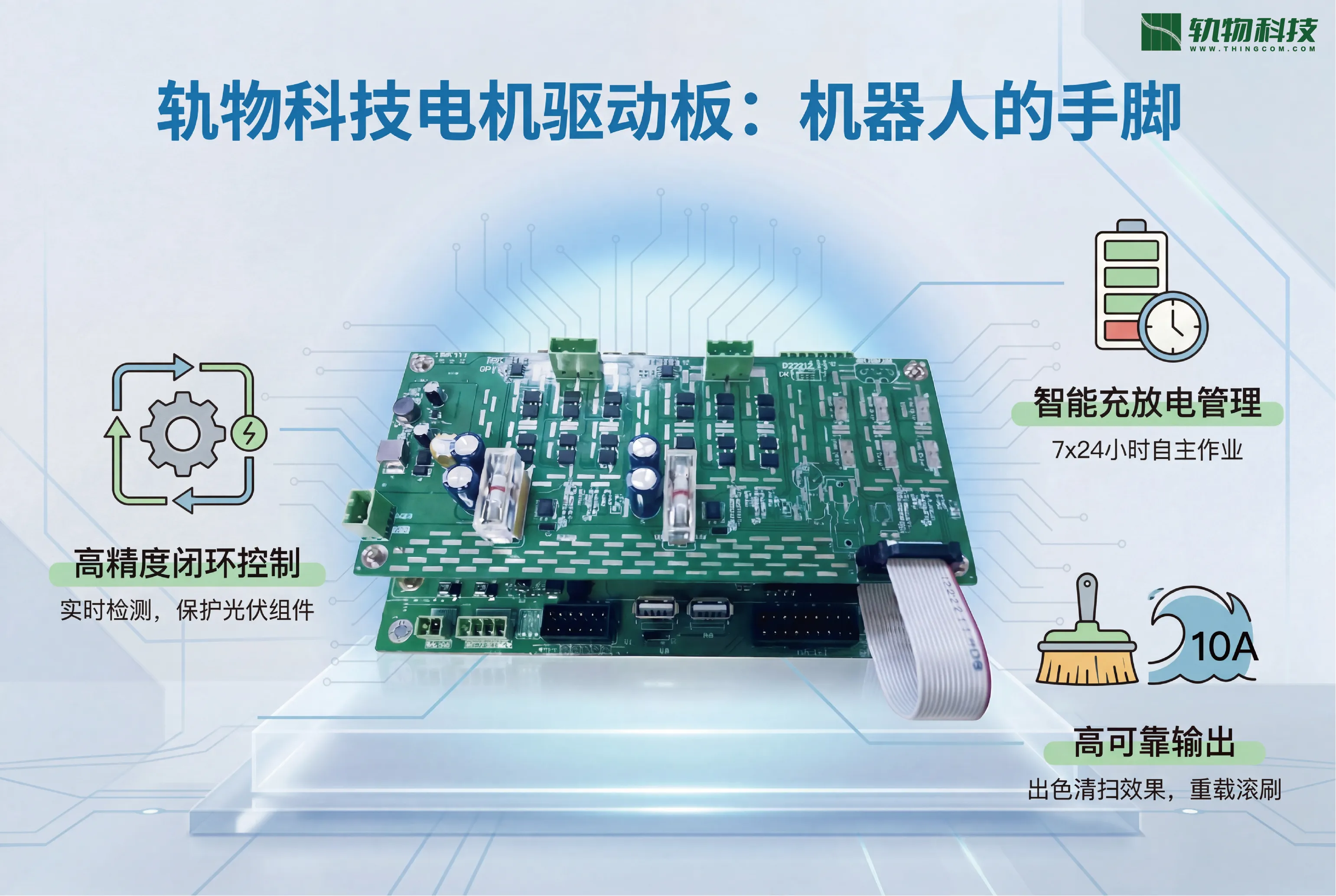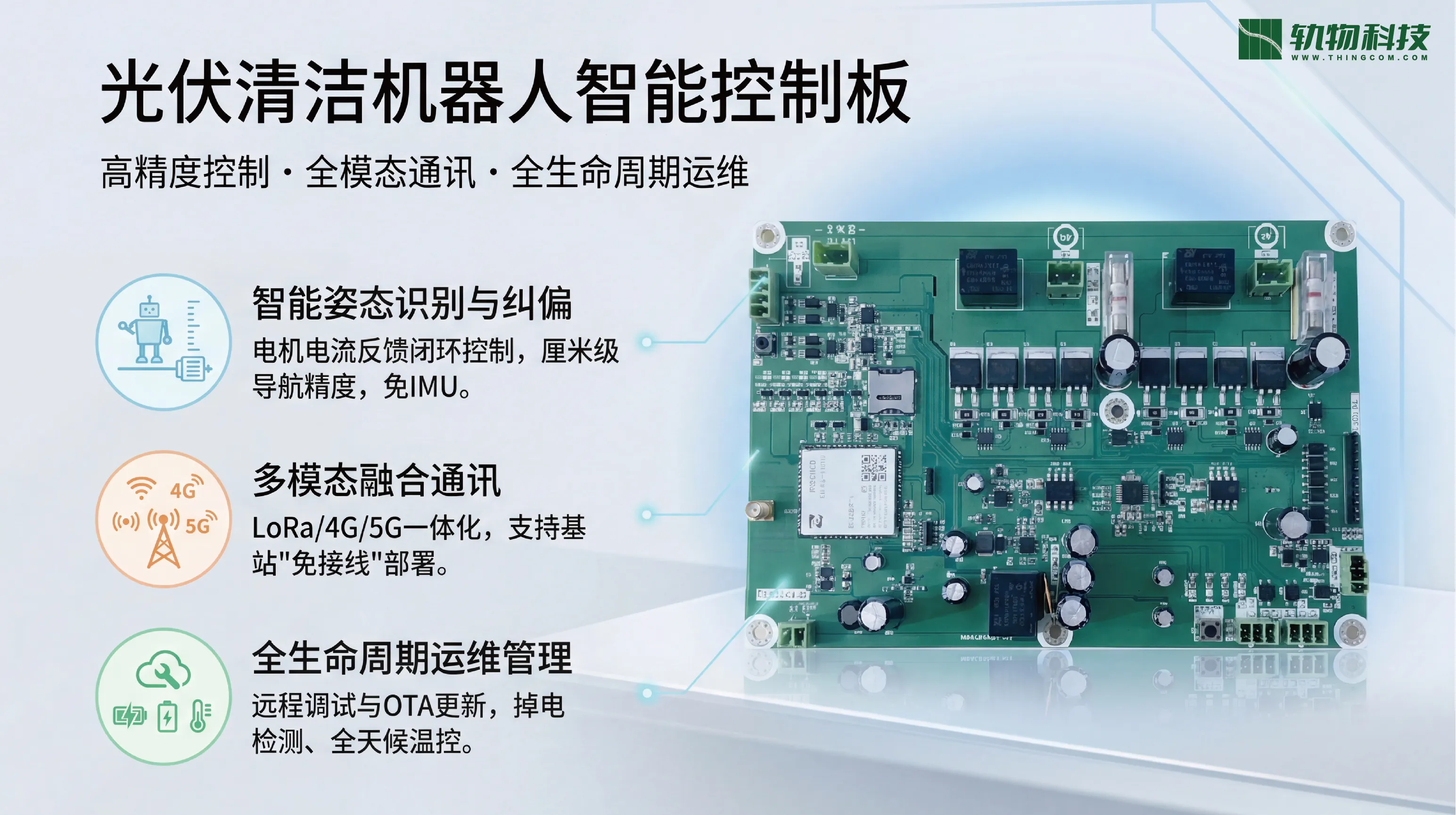 在GW级大型光伏电站时代,光伏清洁机器人已成为继组件、支架、逆变器之后的“第四大核心件”。由于电站大多部署在无人区或地势险要处,传统的“人海战术”运维模式正面临成本高昂、巡检效率低、安全风险大等严峻挑战。杭州轨物科技有限公司凭借深耕物联网与人工智能领域的深度积累,推出了光伏清洁机器人智能控制与运维解决方案,而其中的机器人控制板、电机驱动板以及转运车控制板正是实现“无人值守”智能运维的核心硬件支撑。