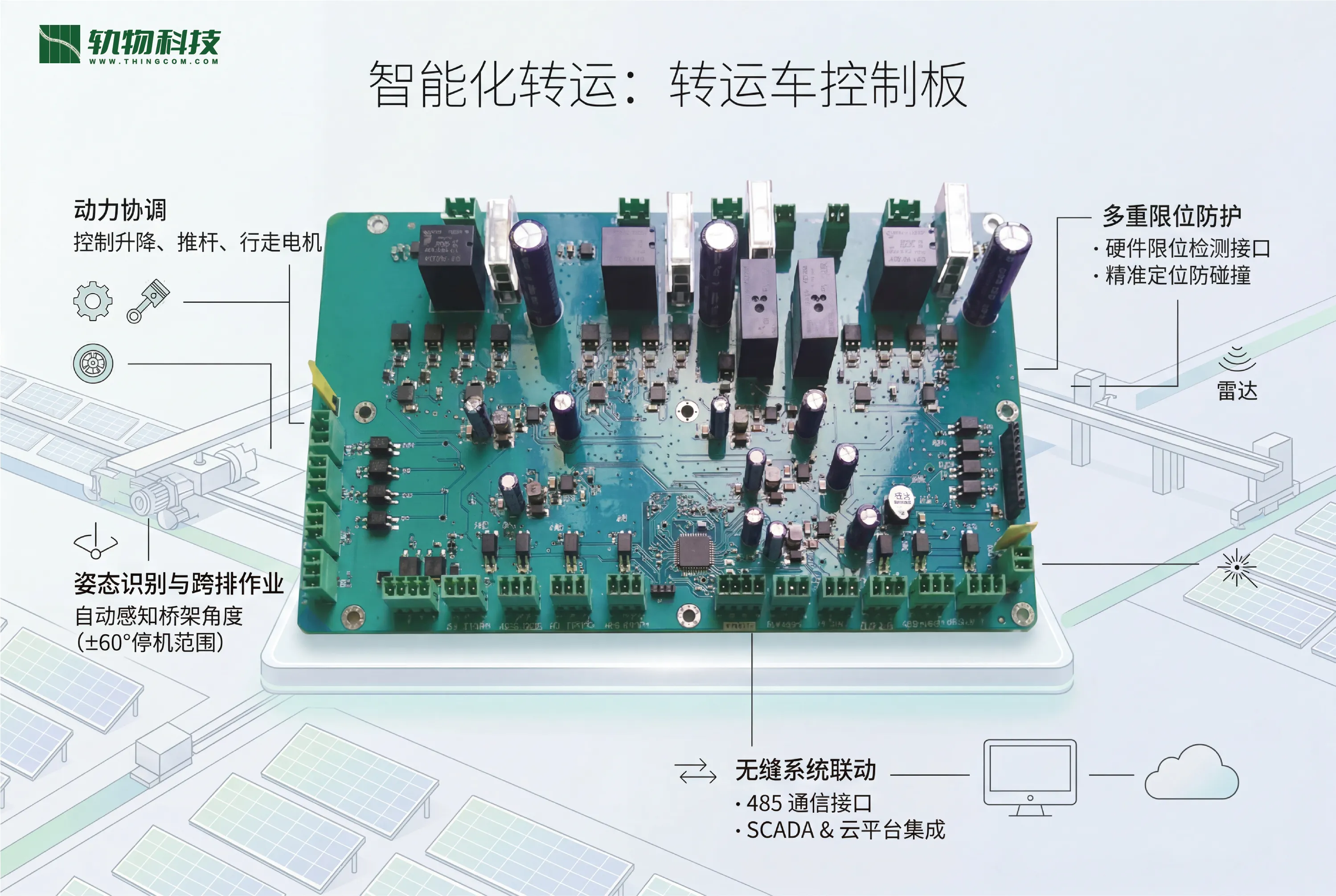 通过“比特”驱动“瓦特”,机器人控制板、电机驱动板与转运车控制板的组合,正在为全球光伏资产的长期健康与稳定增效保驾护航。