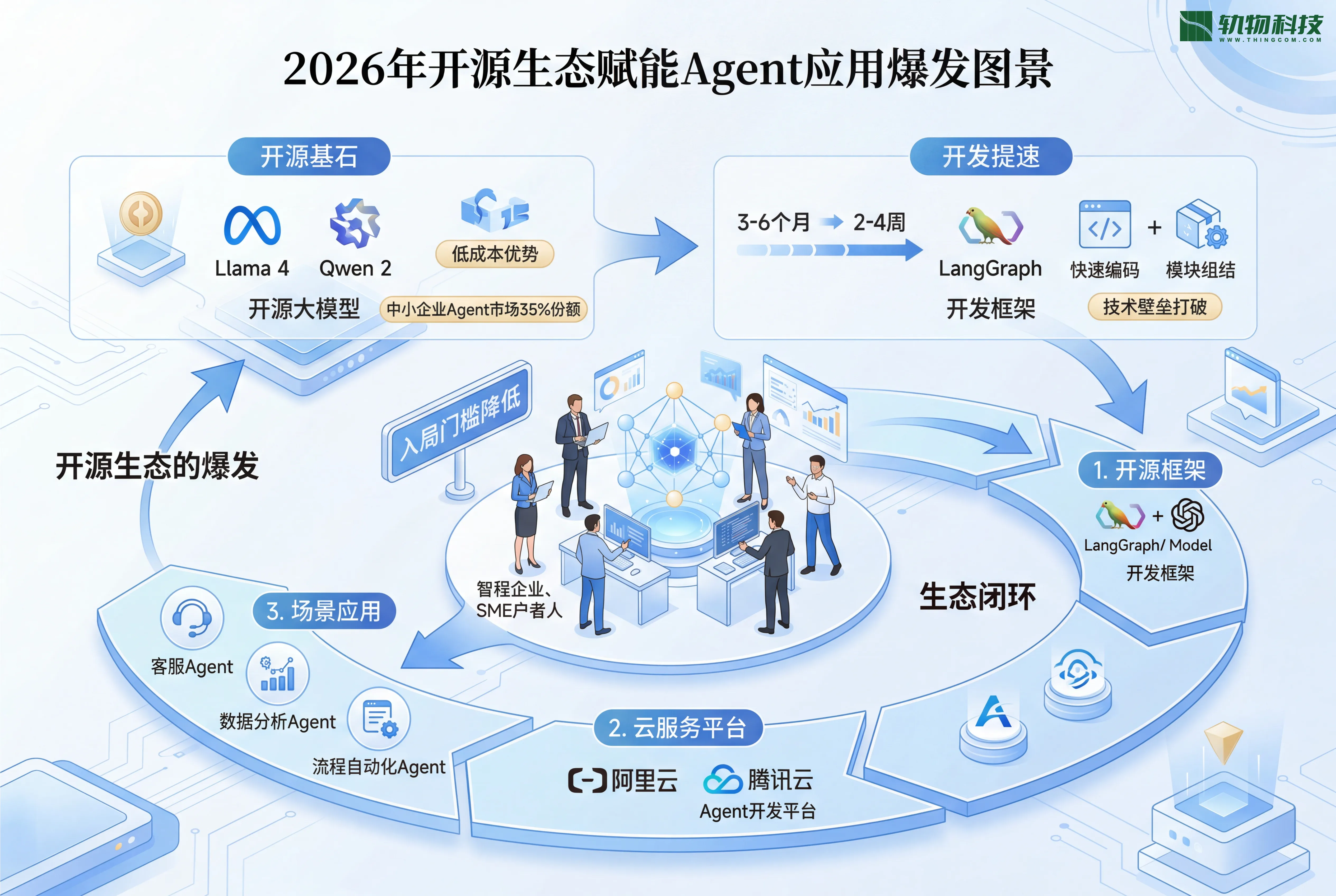 开源生态的爆发,为这种落地提供了坚实的基础设施支撑。2026年以来,Llama 4、Qwen 2等开源大模型凭借低成本优势,占据了中小企业Agent市场35%的份额,而LangGraph等开发框架的普及,让Agent的开发周期从3-6个月缩短至2-4周,彻底打破了技术壁垒。阿里云、腾讯云等头部云厂商纷纷推出Agent开发平台,进一步降低了企业和创业者的入局门槛,形成了“开源框架+云服务+场景应用”的完整生态闭环。